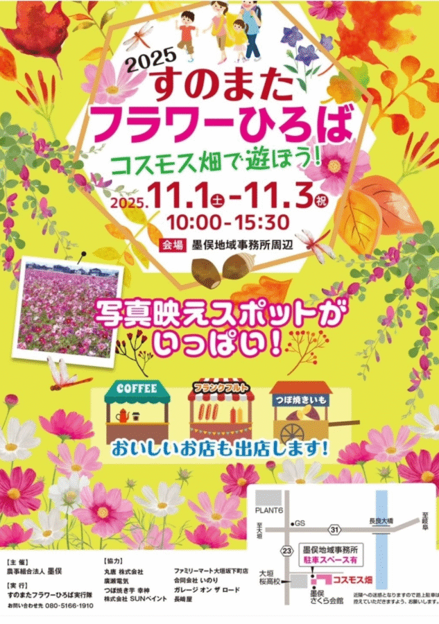 開催日は、2025年11月1日(土)〜3日(月祝)まで。時間は午前10時から午後3時30分まで、会場は大垣市墨俣地域事務所周辺となっています。