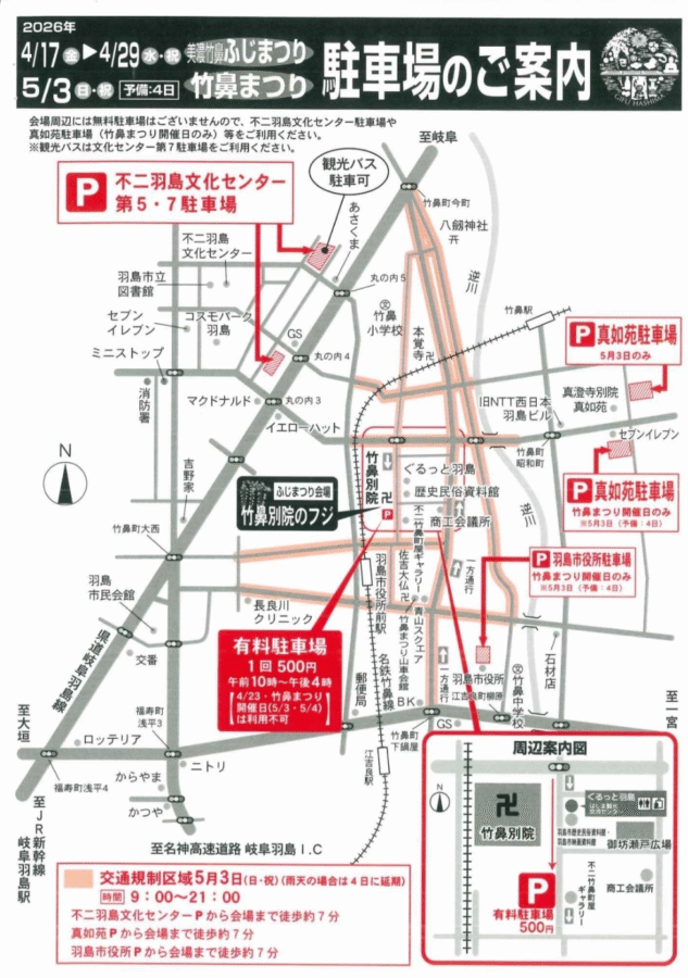 美濃竹鼻ふじまつり期間中の駐車場は、